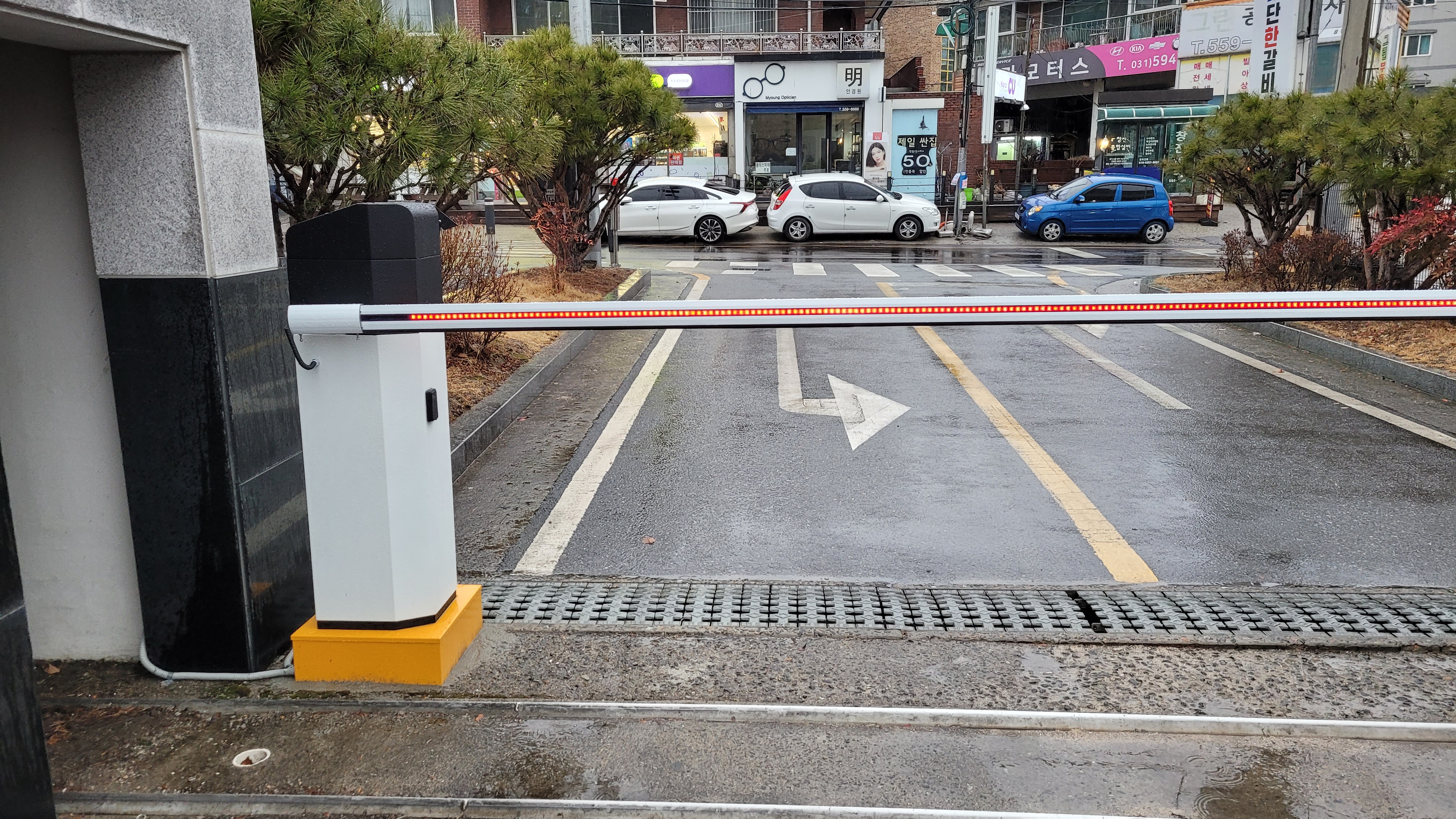 경광등(입/출차 주의등) 설치, 차량번호인식(LPR) 시스템, 주차차단기, 리모컨 방식, 루프 센서(바닥 매립) 시공