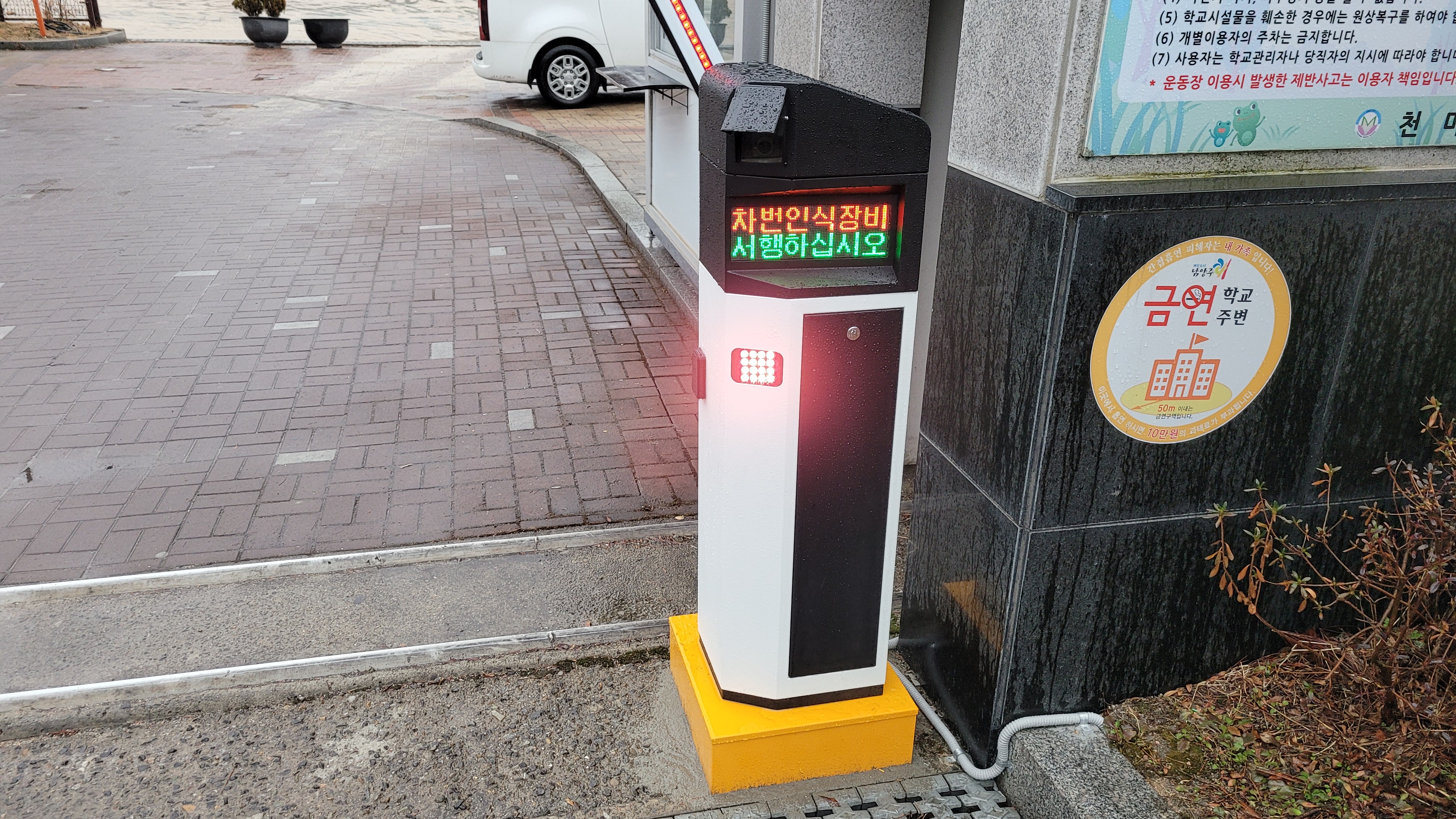 학교 교문 정문 주차장 무루프차량번호인식 차단기 출차주의등 경광등 설치